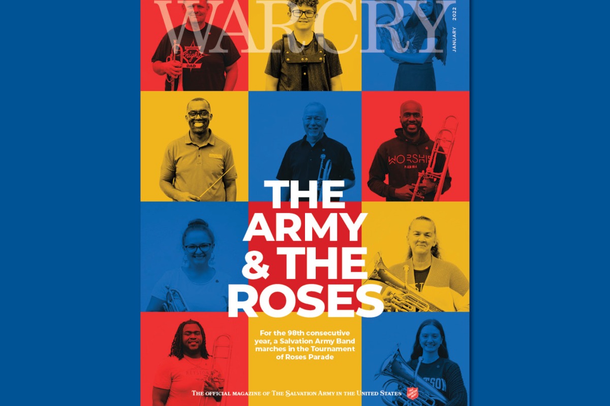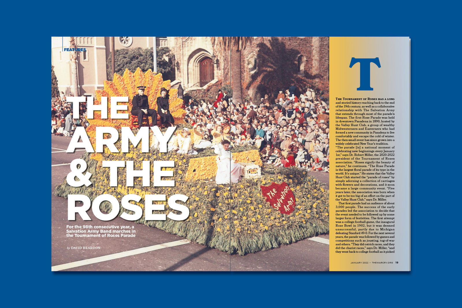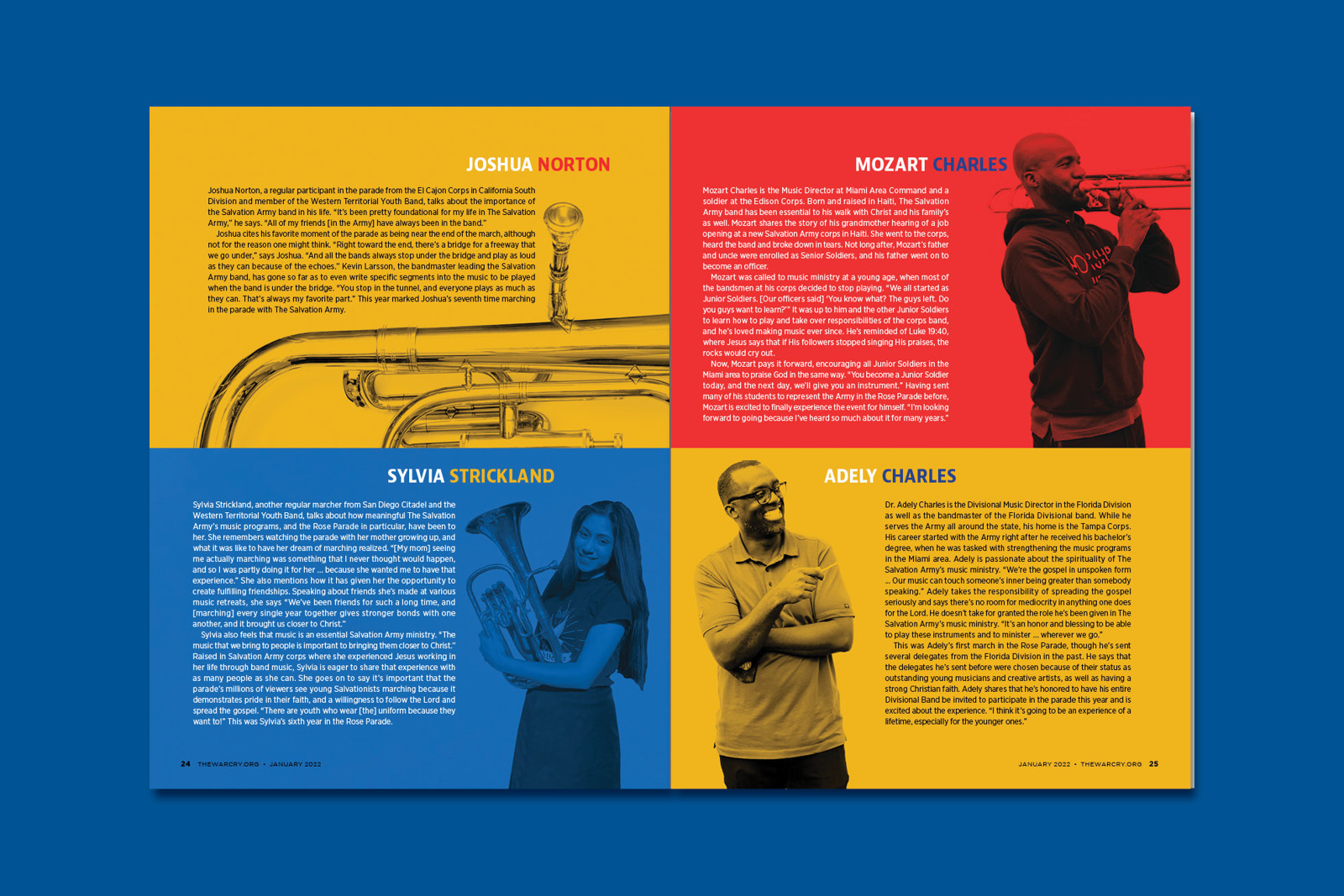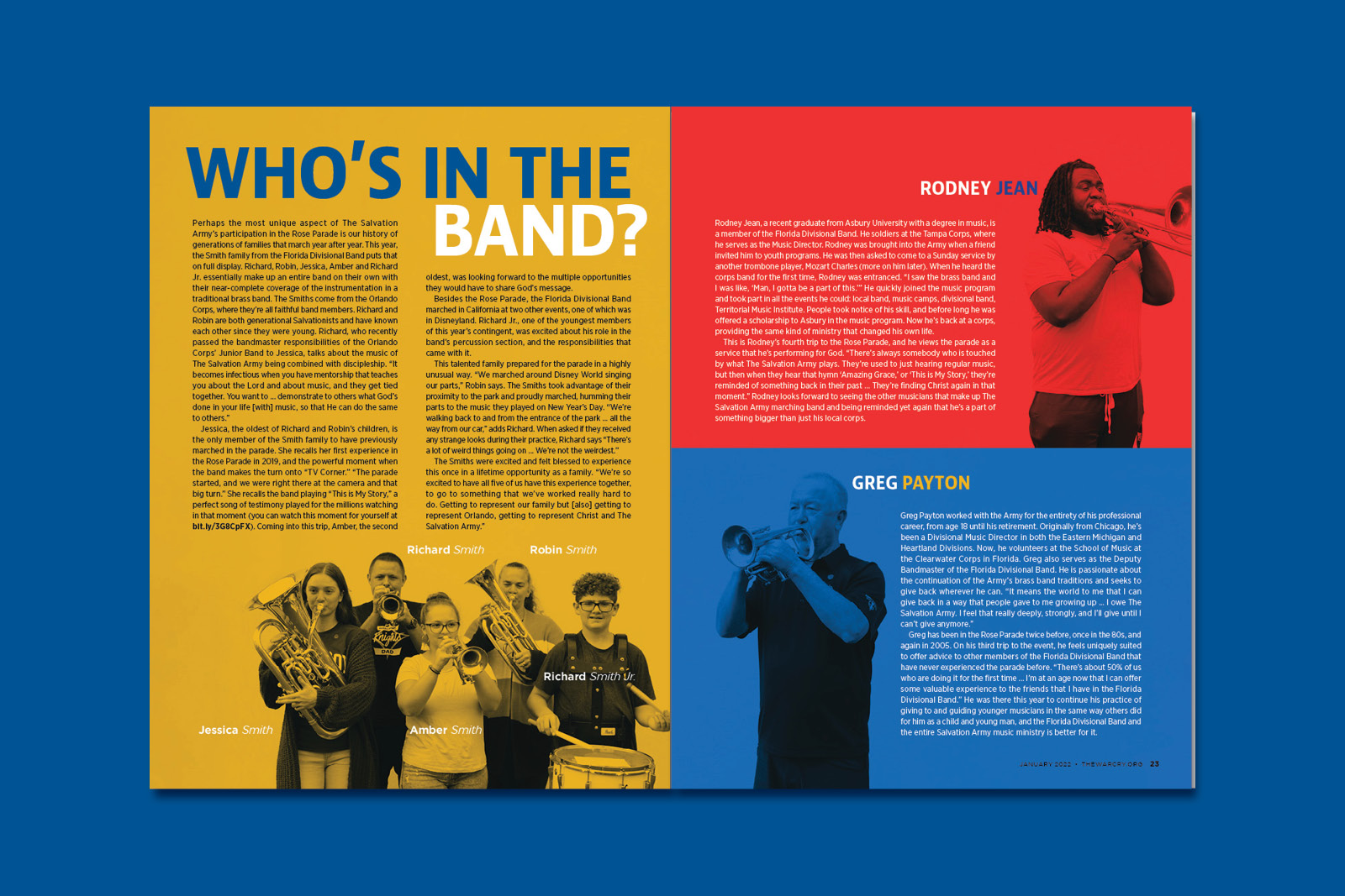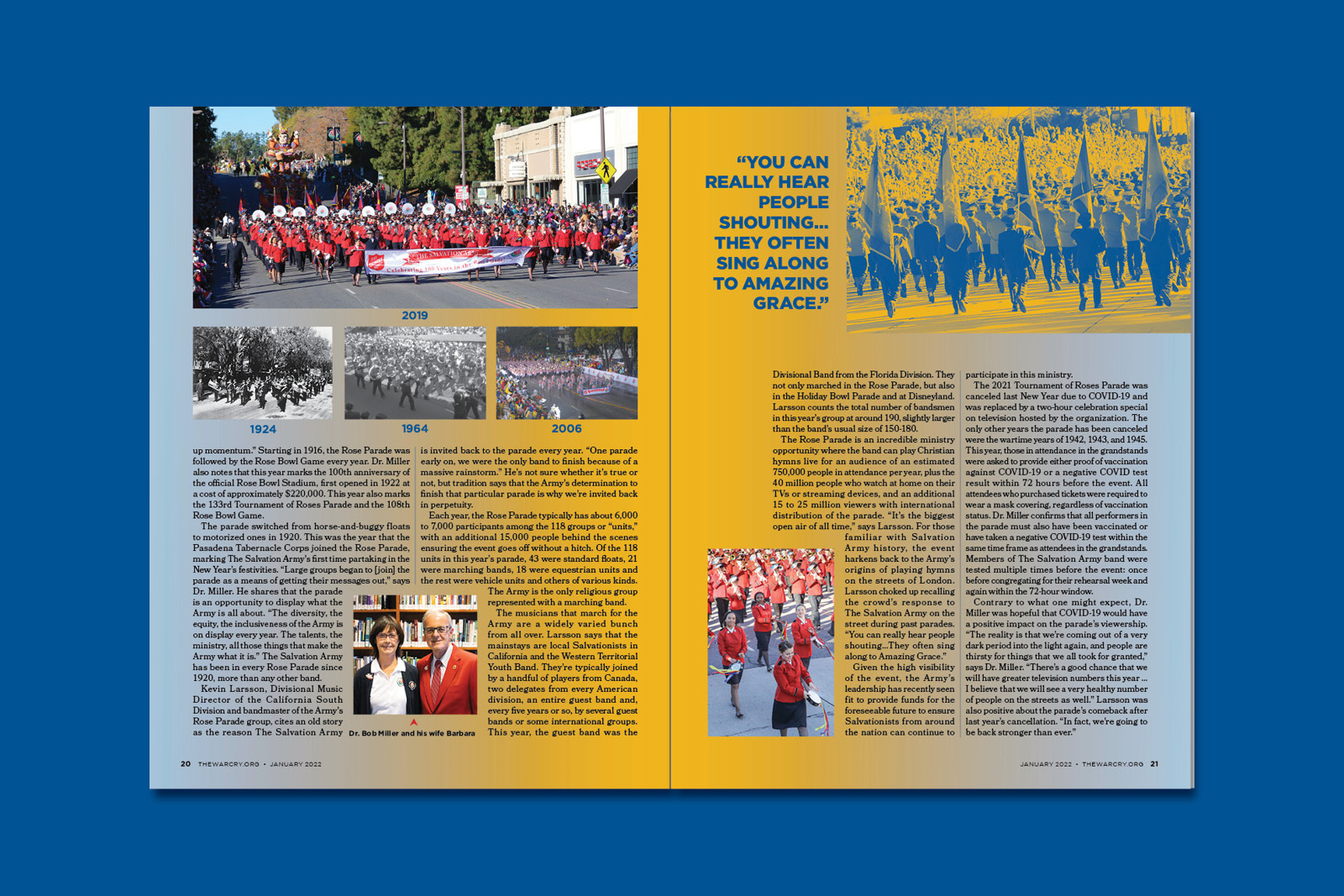 The January 2022 issue of The War Cry featured and overview of The Salvation Army's participation in the annual Rose Bowl Parade and interviews with band members participating in the 2022 parade. Six page feature layout and matching cover design.