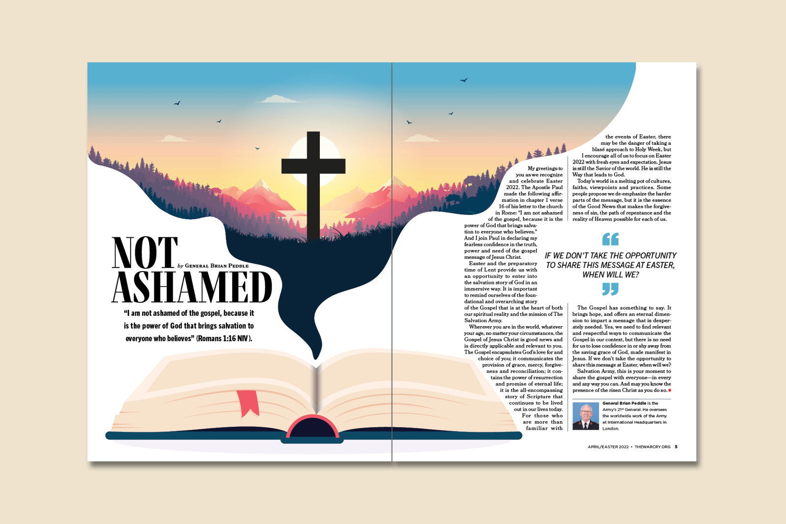 For the special Easter 2022 issue of The War Cry, I created 2 layout options for the Salvation Army General's message. Each concept is two pages.