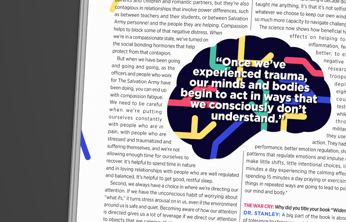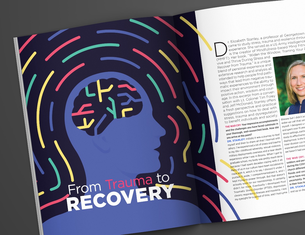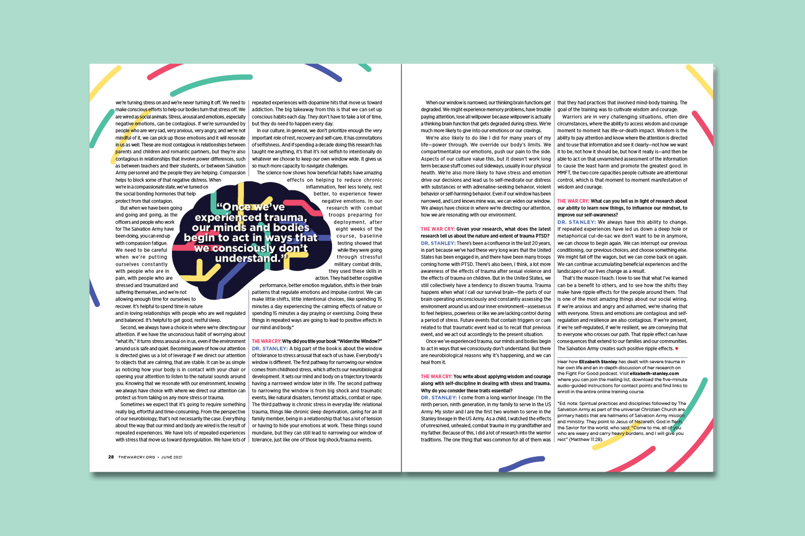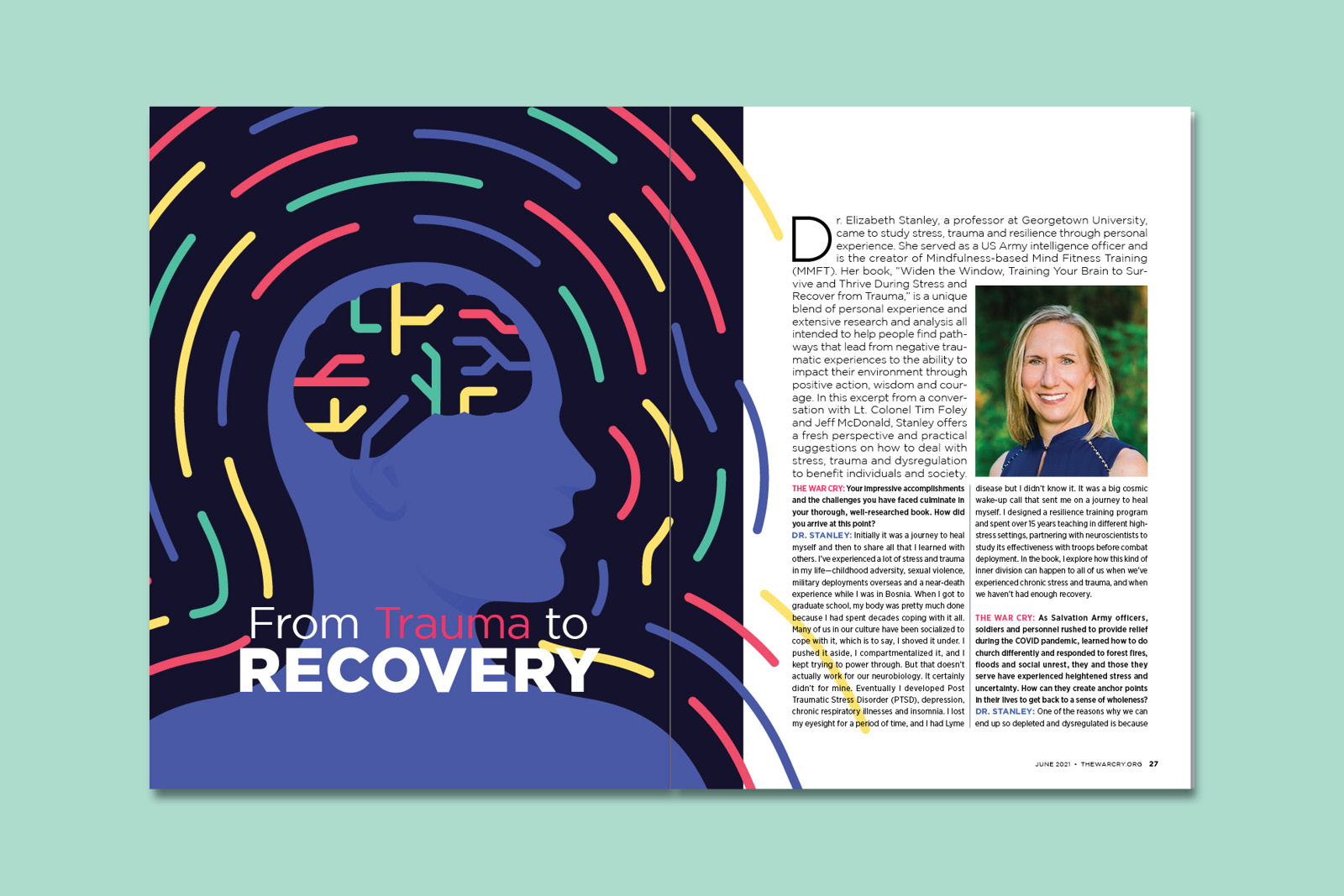 The June 2021 issue's theme on happiness and mental health featured an interview with a psychologist who worked with individuals dealing with PTSD. I created a front cover concept and corresponding feature layout for the interview.