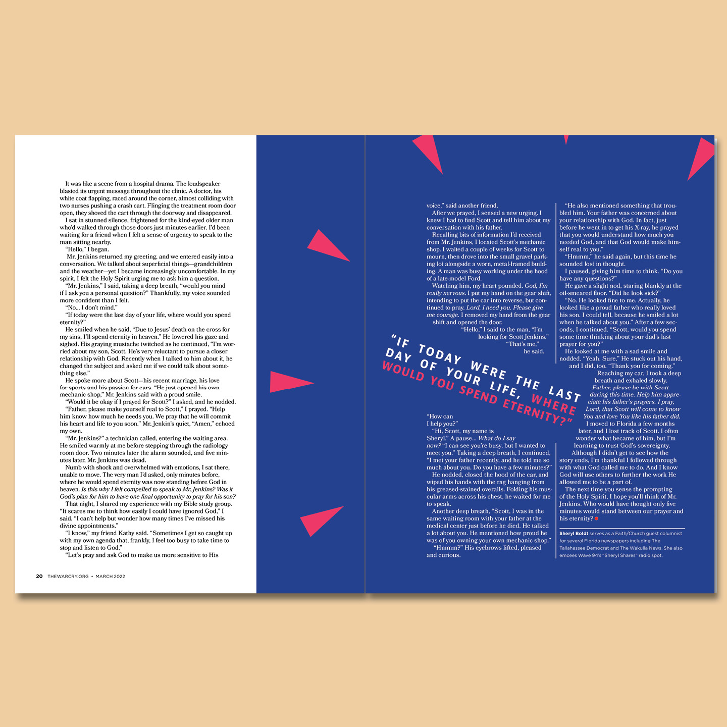 Four page feature layout and matching cover design concept for the March 2022 issue of The War Cry magazine.