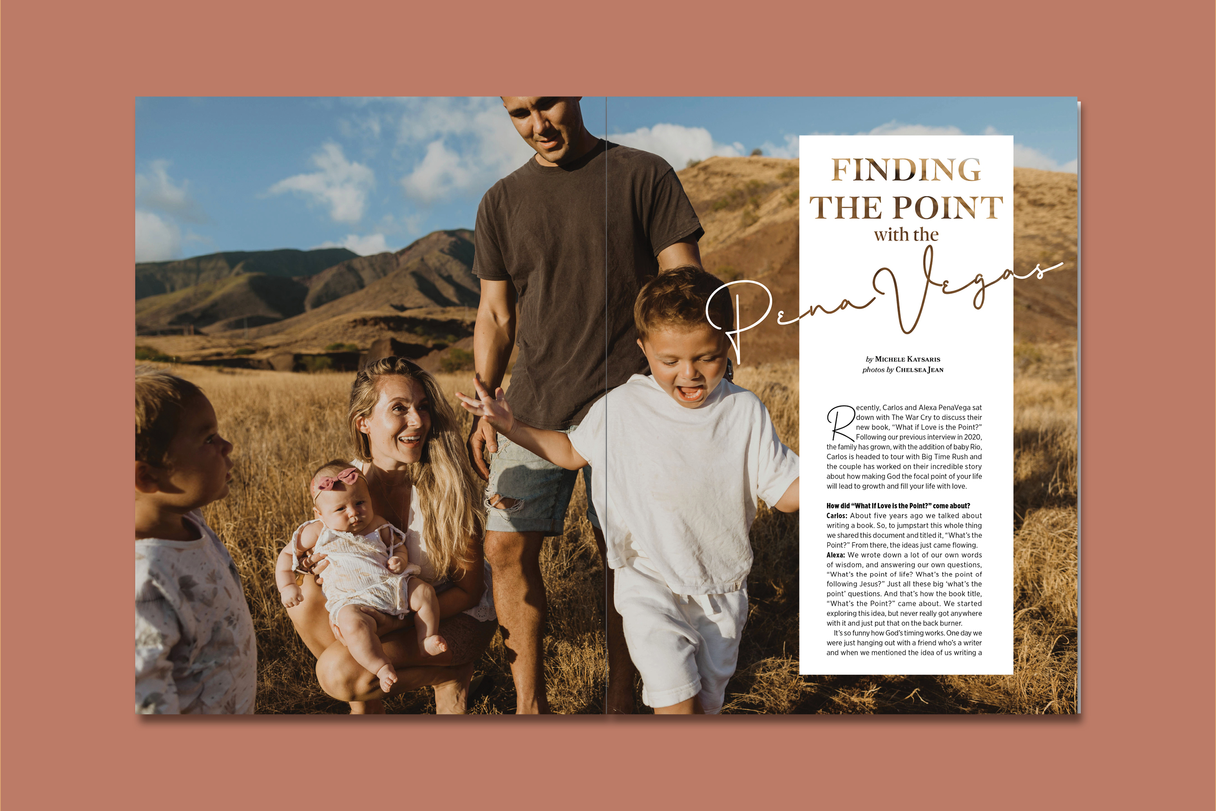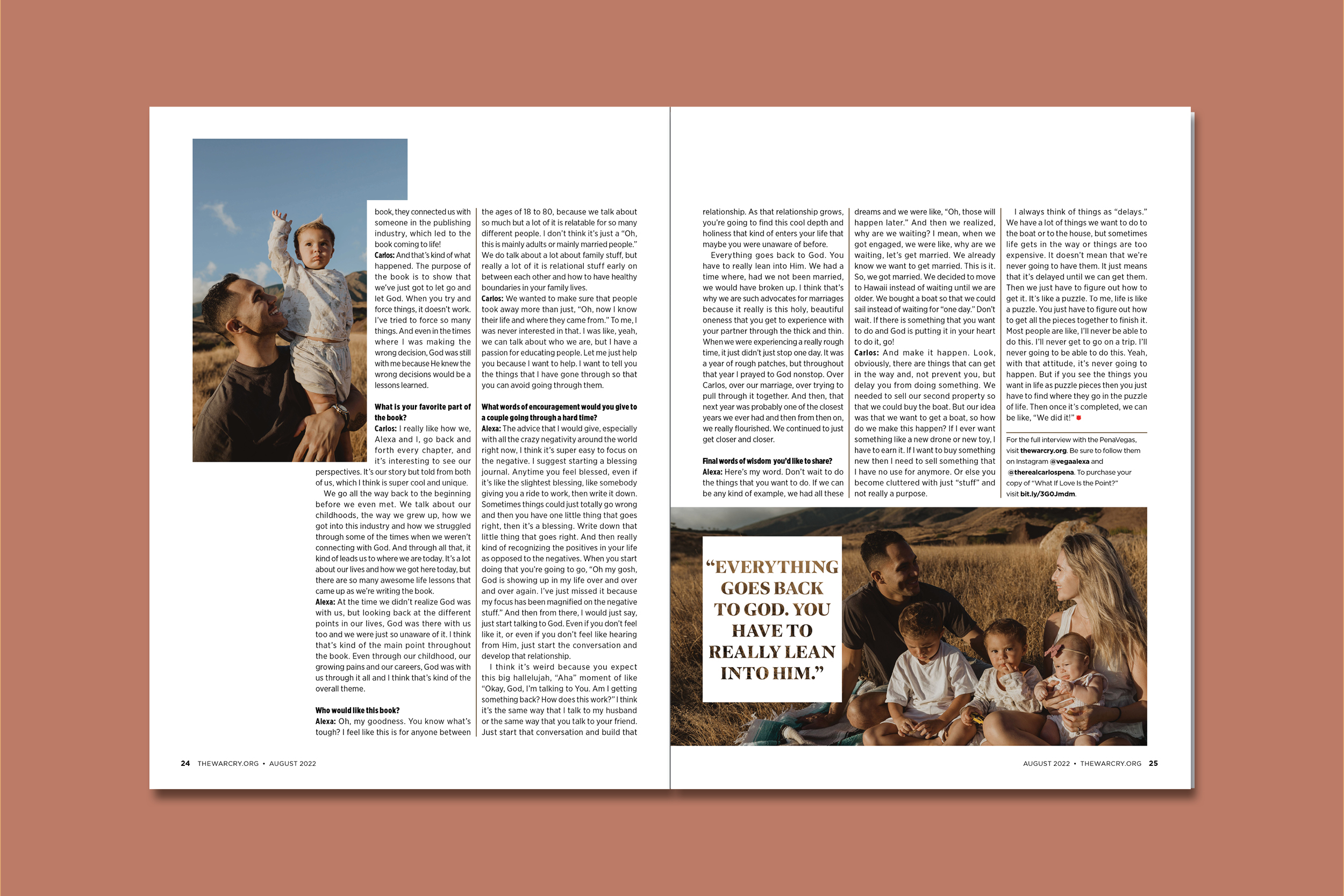 Four page feature interview and cover design with the Christian celebrity couple, Alexa and Carlos Penavega for the August 2022 issue of The War Cry magazine.